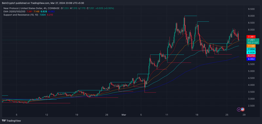 2월 29일부터 3월 13일까지 NEAR의 가격이 눈에 띄게 상승하는 동안 상대 강도 지수(RSI)는 80 이상을 유지했습니다. 이 기간 이후 조정이 이어졌고, 단 4일 만에 NEAR의 가격은 8.84달러에서 6.6달러로 조정되었습니다.