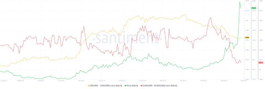 10만~1,000만 갈라를 보유한 주소는 열흘 동안 3,000만 갈라 이상을 판매했습니다. 이러한 매도의 대부분은 갈라 가격이 상승하기 시작한 시점에 집중되어 있어 추가 랠리는 매도의 절대적인 이벤트가 되고 있습니다.