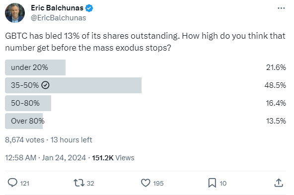 1월 24일, ETF 애널리스트 에릭 발추나스(Eric Balchunas)는 사람들이 그레이스케일이 언제 판매를 중단할 것이라고 생각하는지 알아보기 위해 설문조사를 실시했습니다: