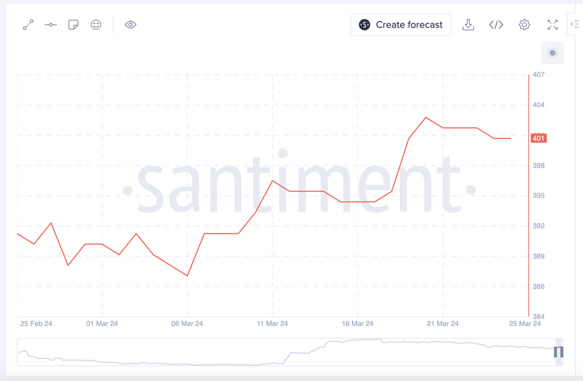 3월 11일부터 3월 20일까지 카르다노의 가격은 0.71달러에서 0.57달러로 하락했습니다. 이 기간 동안 10,000,000 ADA 이상을 보유한 주소의 수는 397개에서 403개로 소폭 증가했습니다. 이러한 변화는 고래들이 가격이 떨어진 틈을 타서 ADA 보유량을 늘렸다는 의미로 풀이됩니다.