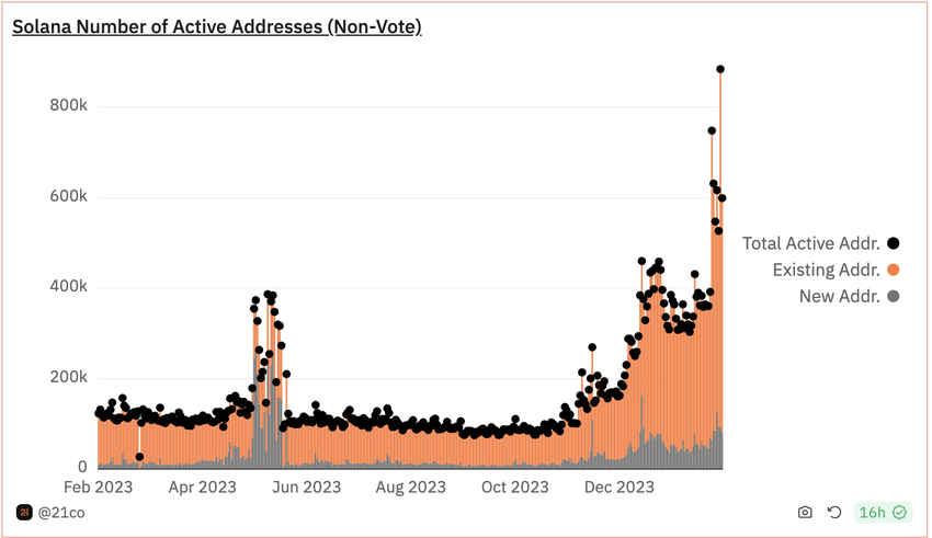 솔라나(SOL) 블록체인은 1월에 활성 주소가 사상 최고치를 기록하는 등 전례 없는 성장세를 보이며 이전 기록을 경신했습니다. 특히 1월 31일에는 솔라나 네트워크의 활성 주소가 884,000개를 넘어섰습니다.
