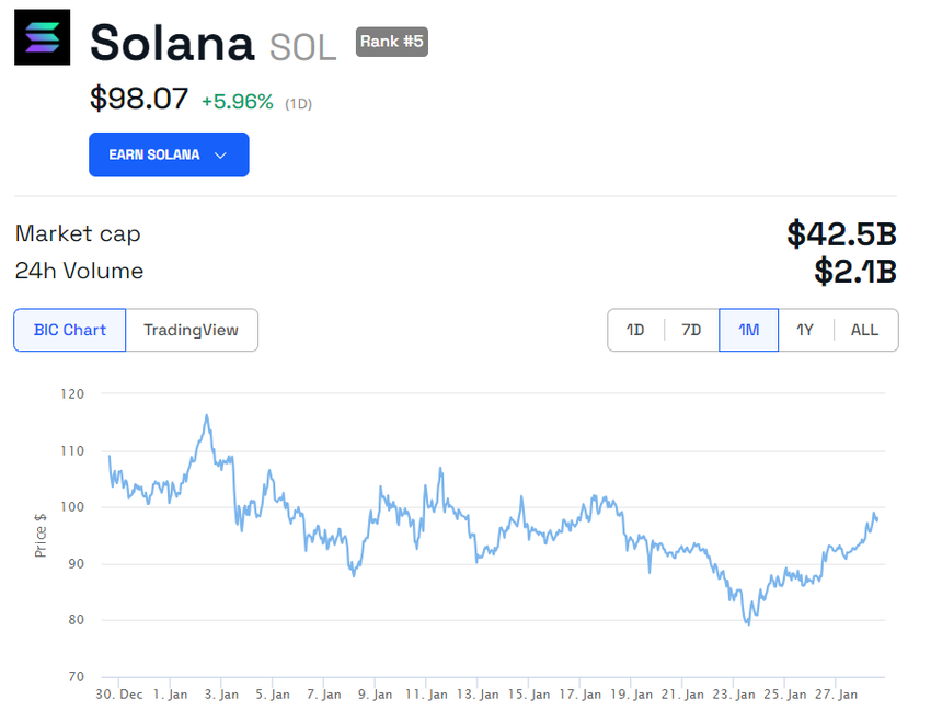실제로 SOL의 가치는 5% 이상 급등하여 약 100달러까지 상승했다가 다시 98달러로 하락했습니다. 이러한 상승세로 인해 시가총액은 425억 달러로 증가했습니다.