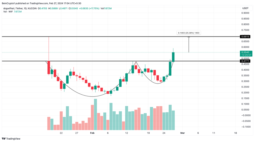 Sponsored흥미롭게도 도그위핫의 가격 상승은 탄탄한 기술적 형성에 뿌리를 두고 있습니다. 이 자산은 더 많은 상승 가능성을 시사하는 강세 지표인 컵 및 핸들 패턴에서 벗어났습니다. 도그위햇이 중요한 네크라인인 0.4771달러 위에서 모멘텀을 유지한다면 25% 추가 상승하여 최고가인 0.6915달러에 도달할 수 있습니다.