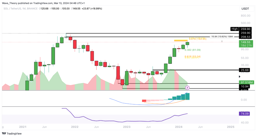 주간 차트에서 솔라나는 주로 강세 신호를 보이고 있습니다. MACD 히스토그램은 지난 주부터 상승 추세를 보이고 있으며, MACD 선이 강세를 교차하고 있습니다. 그러나 RSI는 과매수 영역에 있으며 잠재적으로 약세 다이버전스를 나타냅니다.