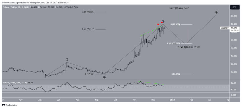 이 계산이 사실로 입증되면 SOL 가격은 25% 조정되어 0.382 피보나치 되돌림 지지선인 $55.60에 도달할 수 있습니다. 그 후 5파가 발생하면 가격이 연중 최고치를 경신할 수 있습니다.