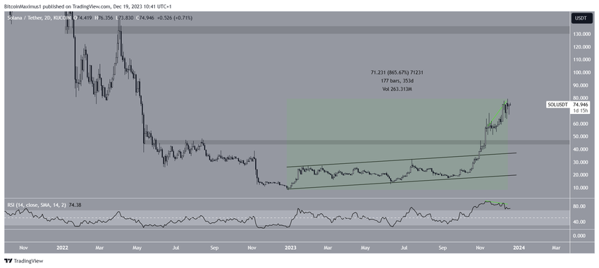 11월에 SOL은 채널의 저항 추세선을 돌파하고 상승 속도를 가속화했습니다. 이로 인해 12월 16일 SOL은 연초 이후 865% 상승한 79.50달러로 연중 최고치를 경신했습니다.
