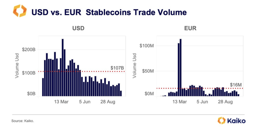 핀테크 기업 템포 프랑스는 향후 3년 안에 유로화 기반 스테이블코인의 거래량 점유율이 0.5%에 달할 것으로 예상합니다. 11월 말까지 유로화 스테이블코인의 거래량 비중은 0.007%에 불과해 미국 달러화보다 훨씬 낮습니다. 마이너스 금리는 또한 유럽 연합에서 유로화 스테이블코인 도입을 막았습니다.