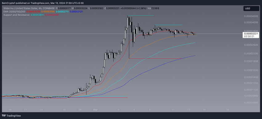 SHIB 4시간 차트를 분석해보면 지수이동평균(EMA)이 시장 박스권 상태를 시사한다는 것을 알 수 있습니다. 특히 20-EMA는 가격과 50-EMA 모두에 근접한 것으로 관찰됩니다. 이러한 정렬은 현재 SHIB의 가격이 횡보하고 있음을 나타내며, 매수자나 매도자 모두 확실한 통제력을 갖지 못하는 시장 불확실성 기간을 반영합니다.