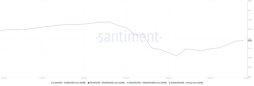 2월 25일부터 3월 4일 사이에 1,000,000~10,000,000 SHIB를 보유한 주소의 수가 548,000개에서 539,000개로 눈에 띄게 감소했습니다. 이러한 감소는 SHIB의 가격이 0.00001달러에서 0.000043달러로 330% 성장한 급등한 가격 상승의 시기와 정확히 일치합니다. 고래의 움직임은 시장 심리와 향후 가격 변동 가능성을 나타내는 중요한 지표입니다. 이들이 자산을 대량으로 매도하거나 매수하는 결정은 가격에 큰 영향을 미칠 수 있습니다.