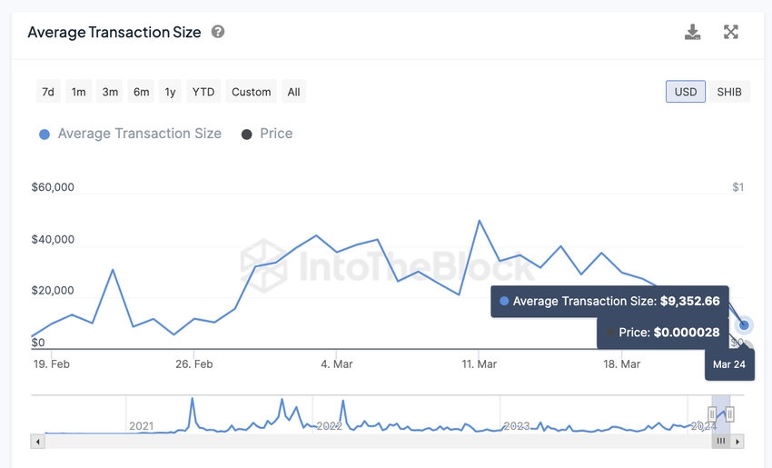 그 후 평균 거래 규모는 더 성장한 후 큰 폭으로 감소했습니다. 구체적으로 3월 11일 49,816달러에서 3월 24일에는 9,352달러로 81.23% 감소했습니다. 특히 지난 4일 동안 SHIB의 평균 거래 규모는 60% 감소했습니다.