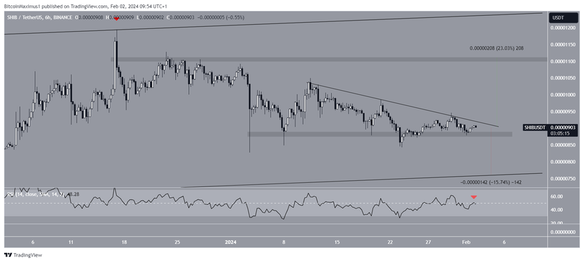 6시간 단기 전망도 마찬가지로 약세입니다. 차트는 SHIB가 약세 패턴으로 간주되는 하강 삼각형 내부에서 거래되고 있음을 보여줍니다. 패턴의 마지막에 가까워지고 있으므로 곧 결정적인 움직임이 예상됩니다.