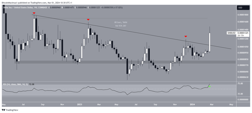 시바 이누(SHIB) 가격은 마침내 560일 하강 저항 추세선을 돌파하고 그 위에서 종가를 시도하고 있습니다.