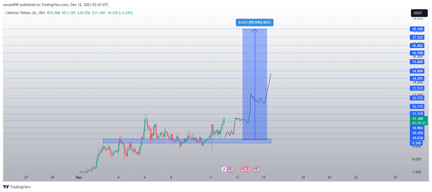 셀레스티아(TIA) 가격은 11월 10일 이후 상승하여 오늘 사상 최고가인 12.47달러에 도달했습니다.