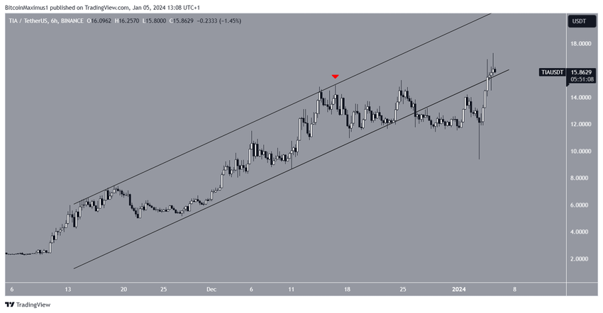 이후 1월 3일에 TIA는 최저 9.36달러까지 떨어졌습니다. 이후 가격이 빠르게 상승하며 채널의 지지 추세선을 되찾았습니다. TIA는 오늘 사상 최고가를 경신했습니다.