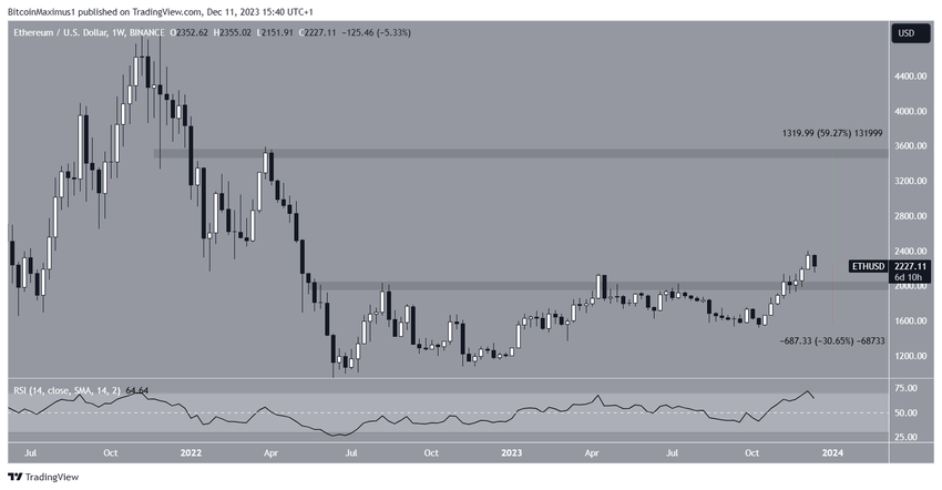 이더리움(ETH) 가격은 10월 초부터 빠르게 상승했습니다. 11월 5일에는 하강 저항 추세선을 돌파하며 상승세를 더욱 가속화했습니다. 수평 저항선에서 잠시 하락한 후 12월 9일 이더리움 가격은 연중 최고치인 2,403달러에 도달했습니다.