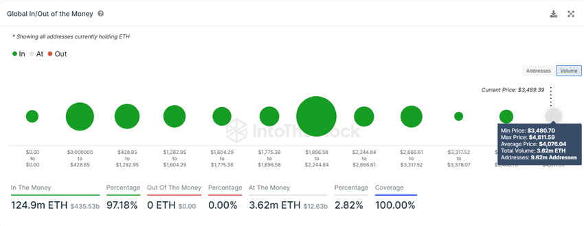 이더리움 보유자들은 최근 40% 상승 기간 동안 많은 공급량이 수익을 내지 못했기 때문에 최근 상승 기간 동안매도 및 차익실현을하지 않은 것으로 보입니다. 그러나 글로벌 인/아웃 오브 더 머니(GIOM) 지표에 따르면 약 362만 개, 126억 9,000만 달러 상당의 이더리움이 수익성을 목전에 두고 있는 것으로 나타났습니다.