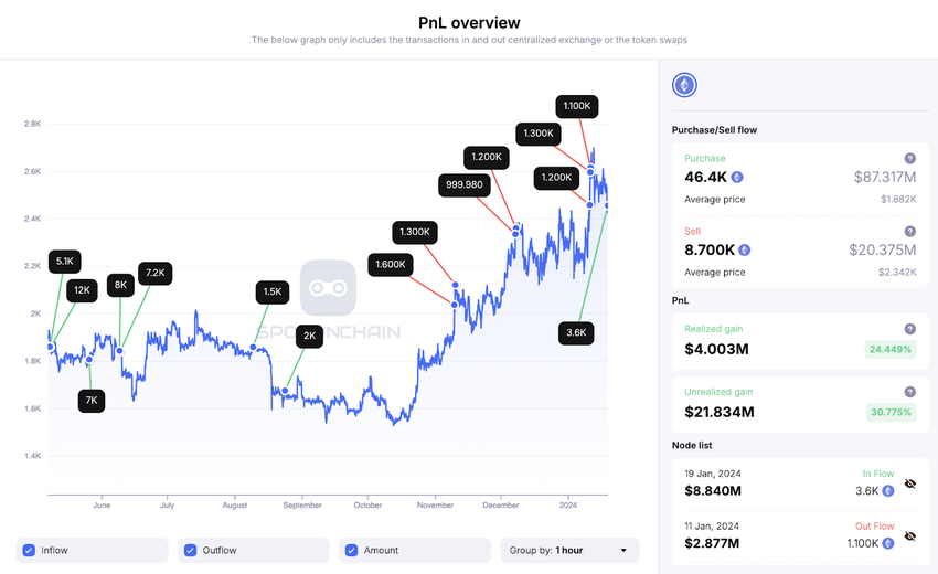실제로 이 고래는 가격이 반등하기 전인 2023년 저점 기간 내내 매집하고 있었습니다. 스포톤체인을 보면, 2023년 5월 8일부터 2023년 8월 24일까지 평균 1,834달러에 바이낸스에서 42,800개의 이더를 매수한 것으로 나타납니다.