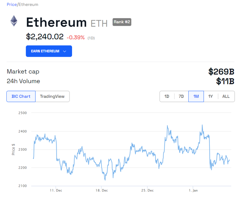 비인크립토의 가격 데이터에 따르면 이더리움은 연초 이후 2,150달러 이상의 안정성을 유지하며 지난 24시간 동안 0.39% 소폭 하락한 2,240달러에 거래되고 있다. 그러나 지난 7일 동안 2.5% 하락하기도 했습니다.