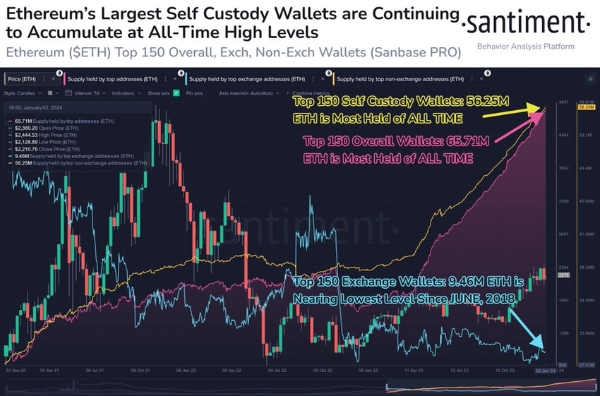 블록체인 분석업체 산티먼트는 이더리움의 가장 큰 자체 수탁 지갑이 “빠른 속도”로 이더리움 상위 암호화폐를 축적하고 있다는 사실을 추가로 확인했습니다. 이 회사는 상위 150개 지갑이 5,600만 개 이상의 이더를 보유하고 있으며, 이는 사상 최고치라고 밝혔습니다.