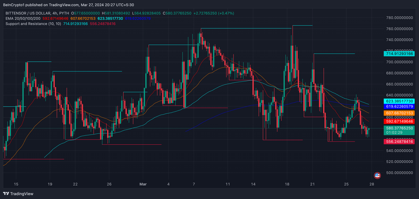 그러나 최고점에 도달한 이후 TAO의 가격은 하락하기 시작하여 약 580달러에서 안정세를 보였습니다. 특히 3월 20일에는 단기 지수이동평균(EMA)이 장기 평균 아래로 하락하는 기술적 변화가 관찰되어 단 이틀 만에 가격이 655달러에서 약 580달러로 급락했습니다.