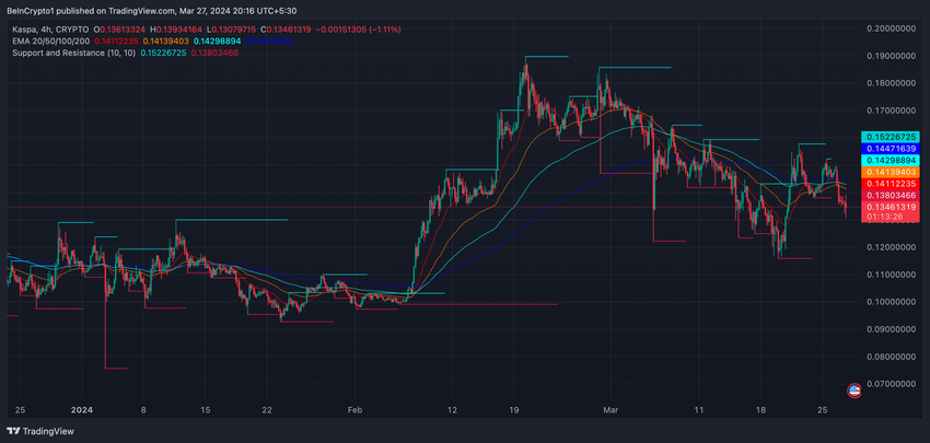 KAS의 하락은 3월 4일에 시작되었습니다. 단기 이평선이 장기 이평선 아래로 떨어지면서 3월 20일까지 가격 하락이 이어졌습니다. 3월 26일에는 새로운 데스 크로스가 형성되었습니다. 이 지표는 종종 KAS의 추가 가격 하락을 나타냅니다.