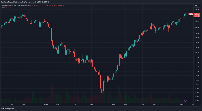 2021년 9월부터 2022년 10월까지 75% 급락했던 메타는 이번 주에 손실을 완전히 만회하고 사상 최고가인 387달러를 기록했습니다. 이것이 더블 탑일까요, 아니면 저항을 뚫고 새로운 고지를 개척하기 위해 META가 폭발할까요?