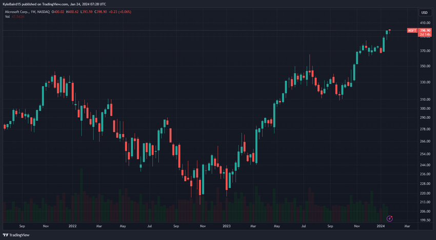MSFT는 2023년 초 220달러에 가까운 장기 저점을 기록한 이후 상승세를 이어가고 있습니다. 최근 주간 종가가 400달러를 약간 밑도는 사상 최고치를 기록했으며 이번 주에도 여전히 상승할 것으로 보입니다.