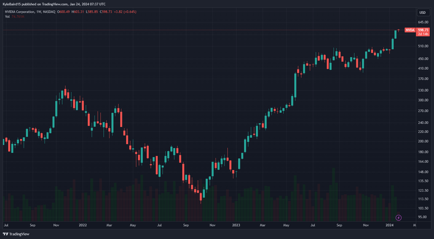 NVDA는 MSFT와 비슷한 궤적을 밟았습니다. 2022년 10월 113달러로 현지 최저가를 기록한 이후 별다른 하락 없이 400% 이상 급등했습니다. 일부 분석가들은 엔비디아가 곧 회사 역사상 여섯 번째로 주식을 분할할 수 있다고 예측하고 있습니다.