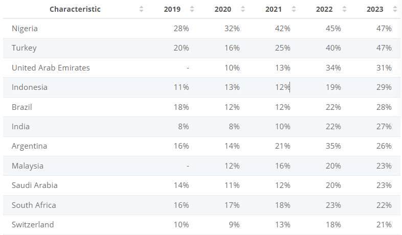 Statista의 데이터에 따르면 2023년 인도네시아는 암호화폐 소유 및 사용 측면에서 상위 국가 중 하나로 꼽혔습니다.