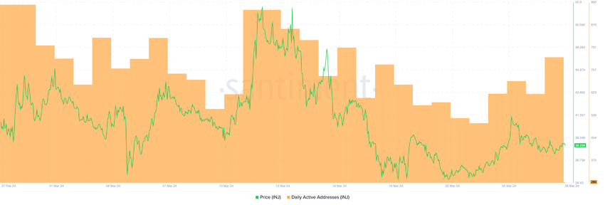 INJ는 최근 일일 활성 주소가 3월 24일 509개에서 3월 28일 755개로 증가했습니다. 이러한 증가세는 3월 중순부터 3월 말까지 활성 주소가 지속적으로 감소하여 3월 12일 932개에서 3월 24일 509개로 감소한 데 따른 것입니다.