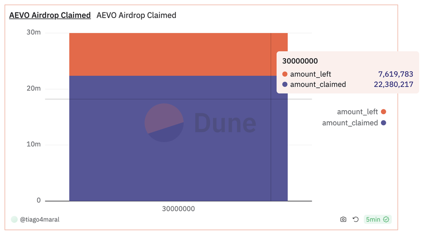 3월 13일 AEVO 에어드랍이 시작되어 3,000만 개의 토큰이 시장에 출시되었습니다. 현재 날짜 기준으로, 이 에어드랍을 통해 제공된 토큰의 상당 부분(약 75%)이 자격을 갖춘 참가자에 의해 성공적으로 청구되었습니다.