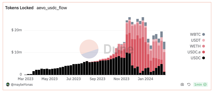 특히 AEVO의 순 입금자 지표는 시간이 지남에 따라 플랫폼의 성장과 사용자 참여를 명확하게 보여주기 때문에 중요합니다. 이전의 하락에도 불구하고 2024년 2월과 3월 사이의 안정적인 입금자 수는 사용자들의 충성도 또는 만족도를 나타낼 수 있는 사용자 기반이 견고해지고 있음을 시사합니다.