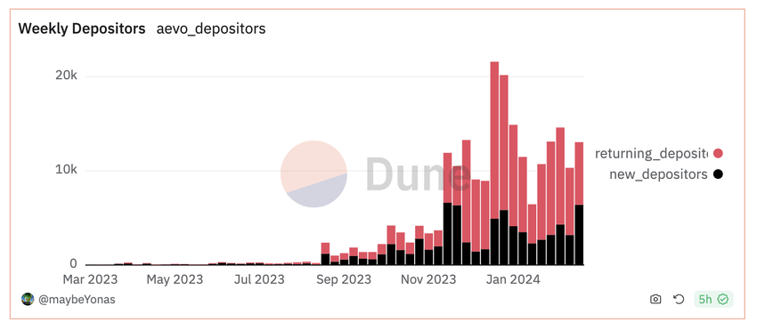 현재까지 AEVO는 78,000명 이상의 고유 예금자를 유치했습니다. 그럼에도 불구하고 TVL 추세에서 관찰되는 궤적과 유사하게 주간 입금자 유입은 평행 패턴을 보입니다.