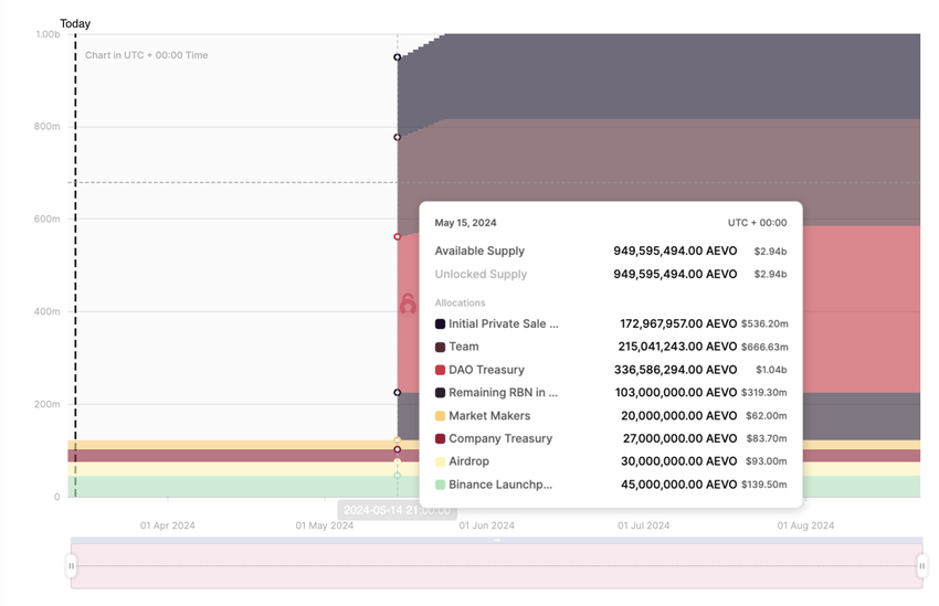 2024년 5월 15일부터 열흘 동안 AEVO는 8억 7,800만 개의 토큰을 출시할 예정입니다. 이렇게 되면 AEVO의 총 공급량은 현재 1억 2,200만 개에 더해 10억 개가 될 것입니다.