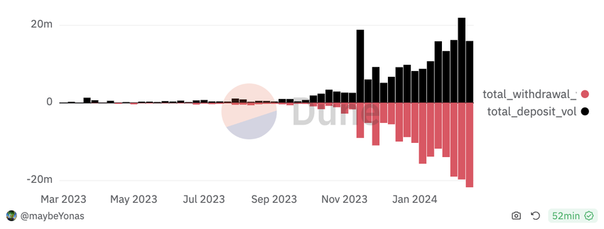 흥미롭게도 에어드랍이 AEVO 플랫폼의 입출금 활동 수준에는 큰 영향을 미치지 않은 것으로 보입니다. 주간 입출금 패턴을 자세히 살펴보면, 특히 2023년 말부터 2024년 초까지 입금액이 출금액을 크게 넘어선 것으로 나타났습니다.