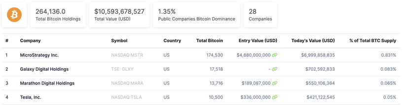 Sponsored코인게코에 따르면, 테슬라는 현재 약 10,500 BTC를 보유하고 있습니다. 이는 비트코인 보유량이 가장 많은 상장 기업 중 4위에 해당합니다.
