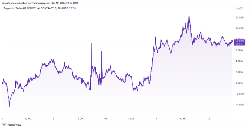 이번 주 도지코인의 7.7% 가격 상승은 미국 증권거래위원회(SEC)의 비트코인 현물 ETF 승인으로 촉발된 암호화폐 시장의 전반적인 상승 추세와 일치합니다.