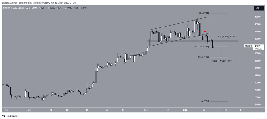 1월 16일 채널의 지지 추세선이 거부된 후, BTC는 하락세를 재개했습니다. 어제 하락세가 가속화되면서 41,400달러의 수평 지지선이 무너졌습니다. BTC는 최저치인 39,437달러까지 하락하며 0.382 피보나치 되돌림 지지선까지 도달했습니다.
