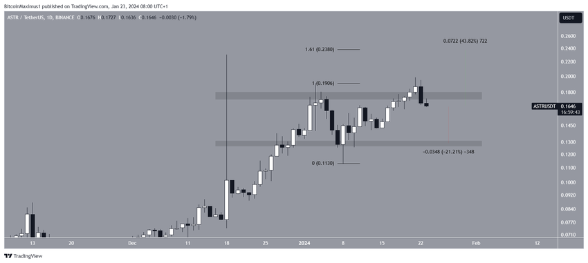 ASTR 가격은 2023년 10월 16일 이후 급격히 상승했습니다. 이러한 상승세는 12월 18일에 0.23달러로 최고치를 기록했습니다. 이후 가격이 하락하여 긴 위쪽 심지(빨간색 아이콘)가 형성되었습니다.