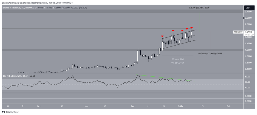 첫째, STX 가격은 20일 동안 상승 병렬 채널 내에서 거래되었습니다. 이러한 채널에는 일반적으로 조정 움직임이 포함되어 있으므로 패턴에서 벗어날 가능성이 가장 높은 시나리오입니다. 또한 일일 RSI는 약세 다이버전스(녹색선)를 생성했습니다.