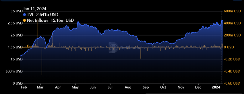 올해 초부터 블록체인은 2억 5천만 달러를 초과하는 주목할 만한 긍정적인 순유입을 목격했습니다. 이러한 급증으로 인해 Arbitrum의 TVL은 1월 12일에 26억 4천만 달러에 달하며 사상 최고치를 기록했습니다.