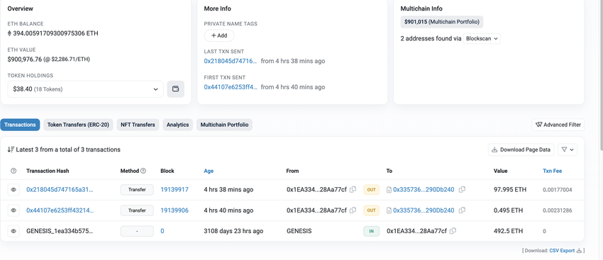 이와는 별도로 거의 10년 동안 비활성 상태였던 이더리움 지갑이 갑자기 다시 활성화되었습니다. 암호화폐 트래커인 웨일 얼러트(Whale Alert)가 이 사실을 보도했습니다. 해당 지갑에는 현재 110만 달러가 넘는 492 이더리움이 보관되어 있습니다.
