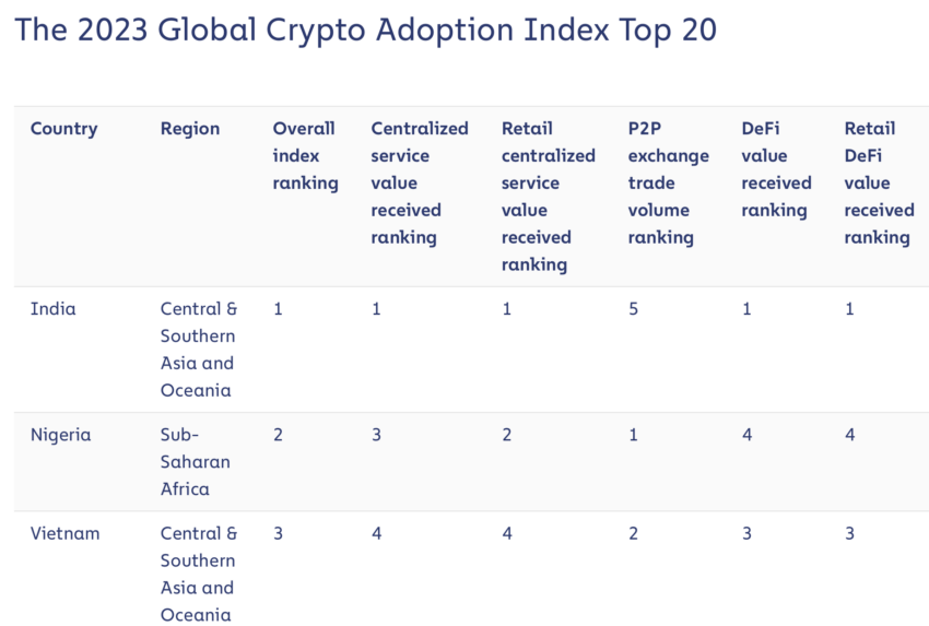 특히, 체인널리시스 2023년 글로벌 암호화폐 채택 지수에서 인도는 1위를 차지했습니다.