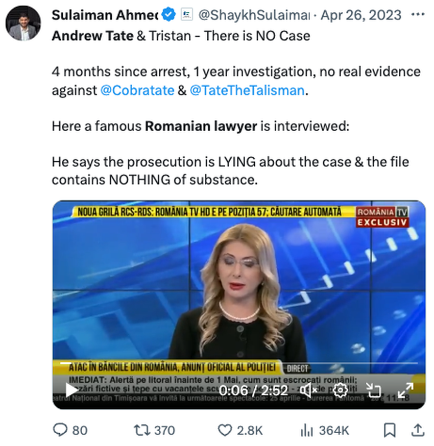 테이트와 그의 동생 트리스탄은 2022년 12월부터 2023년 4월까지 경찰에 구금되어 있습니다. 이들은 8월에 가택 연금으로 전환되어 더 자유롭게 이동할 수 있게 되었습니다. 이들은 강간, 인신매매, 여성 착취를 위한 갱단 결성 등의 혐의로 기소된 4명의 용의자 중 한 명이었다.