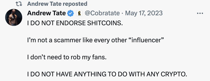 암호화폐 커뮤니티에서는 인플루언서 앤드류 테이트가 출시할 것으로 알려진 새로운 코인의 진위 여부에 대해 회의적인 반응을 보이고 있습니다. 뉴스 미디어는 그가 자신의 돈 1억 달러로 새로운 코인을 후원할 것이라는 의문의 트윗을 올렸습니다.