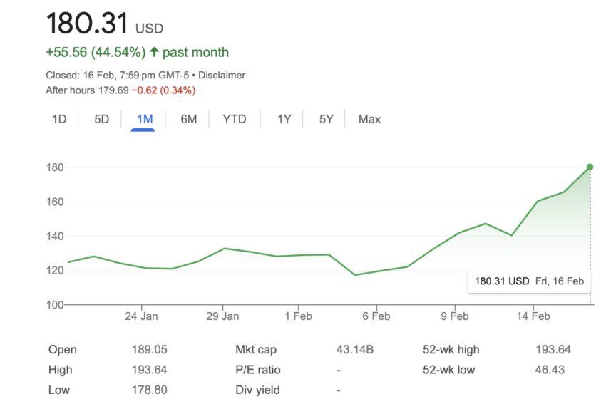 COIN의 가격은 2월 16일 주말 장이 마감되기 전 180.31달러에 도달했습니다.