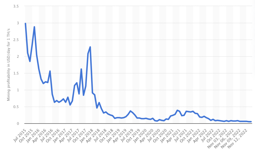 그러나 2022년 11월까지의 Statista 데이터에 따르면 비트코인 채굴의 수익 증가율은 지난 몇 년 동안 크게 감소했습니다.