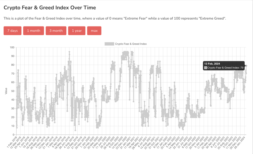 시장 심리를 측정하는 중요한 지표인 암호화폐 공포와 탐욕 지수는 비트코인이 사상 최고치를 기록한 이후 전례 없는 수준으로 치솟았습니다. 최근 데이터에 따르면 2월 13일 이 지수는 79까지 치솟으며 비트코인이 69,000달러까지 치솟았던 2021년 11월 중순 이후 최고치를 기록했습니다.