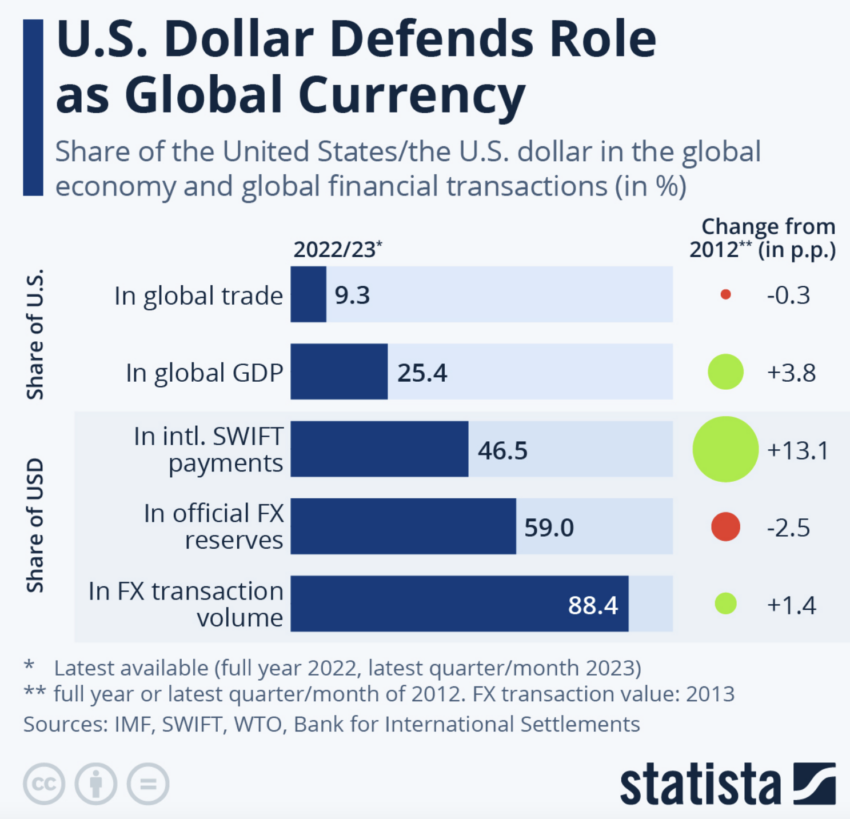 Statista는 최근 미국 달러가 글로벌 통화 중 선두 자리를 유지하고 있다고 보고했습니다. 지난해 달러는 전 세계 무역 거래의 9.3%를 차지했으며, 국제 SWIFT 은행 결제의 46.5%를 차지했습니다.