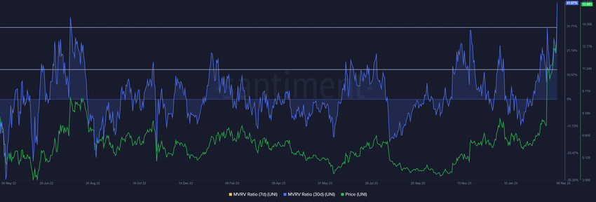 유니스왑의 경우 30일 MVRV는 44%로, 최근 투자자가 44%의 수익을 보유하고 있음을 의미합니다. 이들은 차익 실현을 위해 보유 자산을 처분하여 잠재적으로 매도를 일으킬 수 있습니다. 역사적으로 유니스왑은 아래 차트에서 ‘위험 구간’으로 불리는 11%~33% 영역에 도달하면 상당한 조정을 경험했습니다.